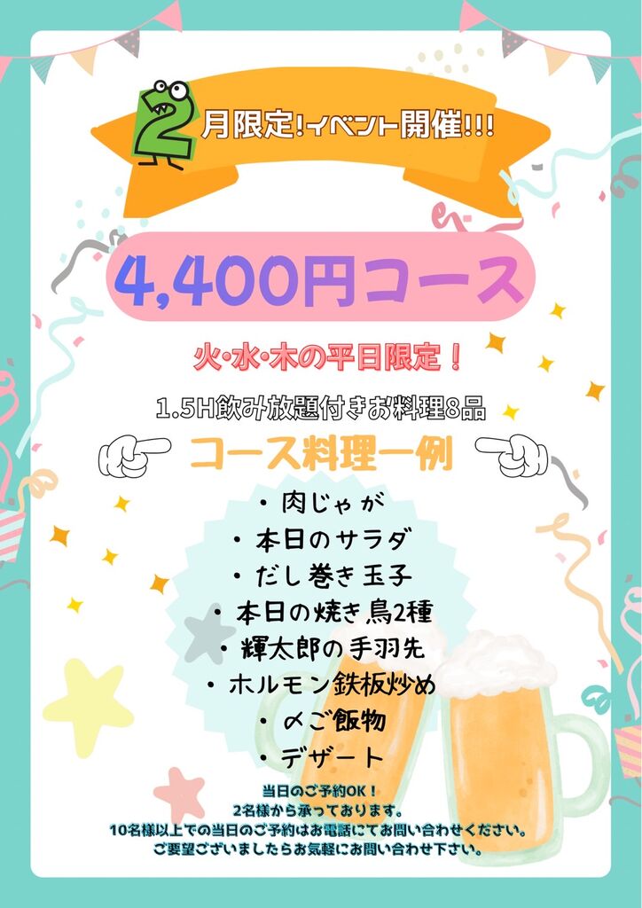 イベント 【2月限定!】【火、水、木限定!】【¥4,400コース】1.5H飲み放題付き8品(26/01/06)