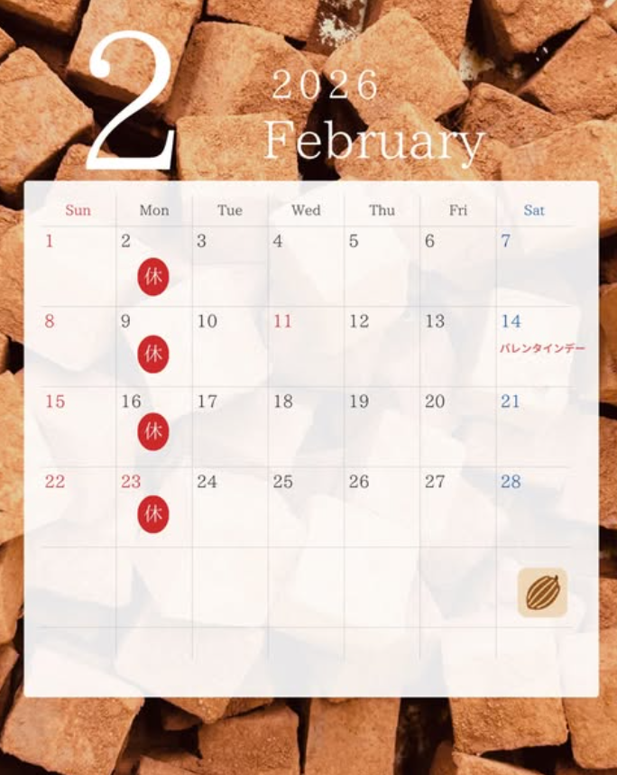 2月は定休日の月曜日がお休みになります。
