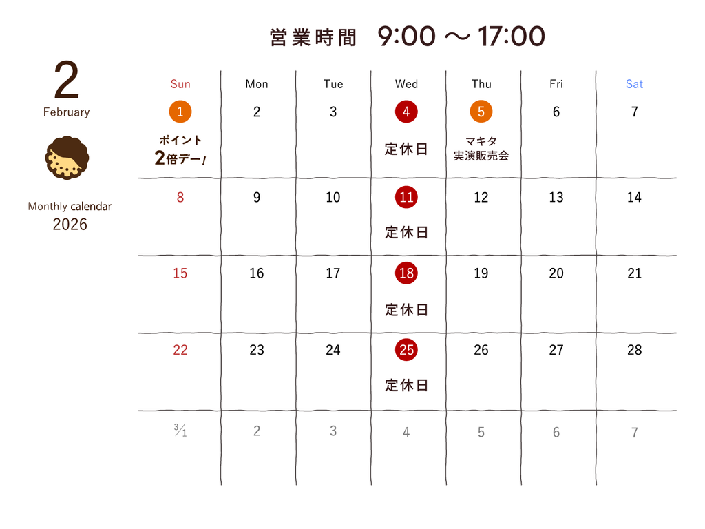お知らせ 2月の営業日のお知らせ(26/02/03)
