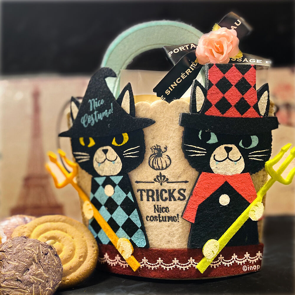 10種のハロウィンギフトその⑥は、まんまるおめめがキュートな黒ネコさんたちのフェルトバッグ♪