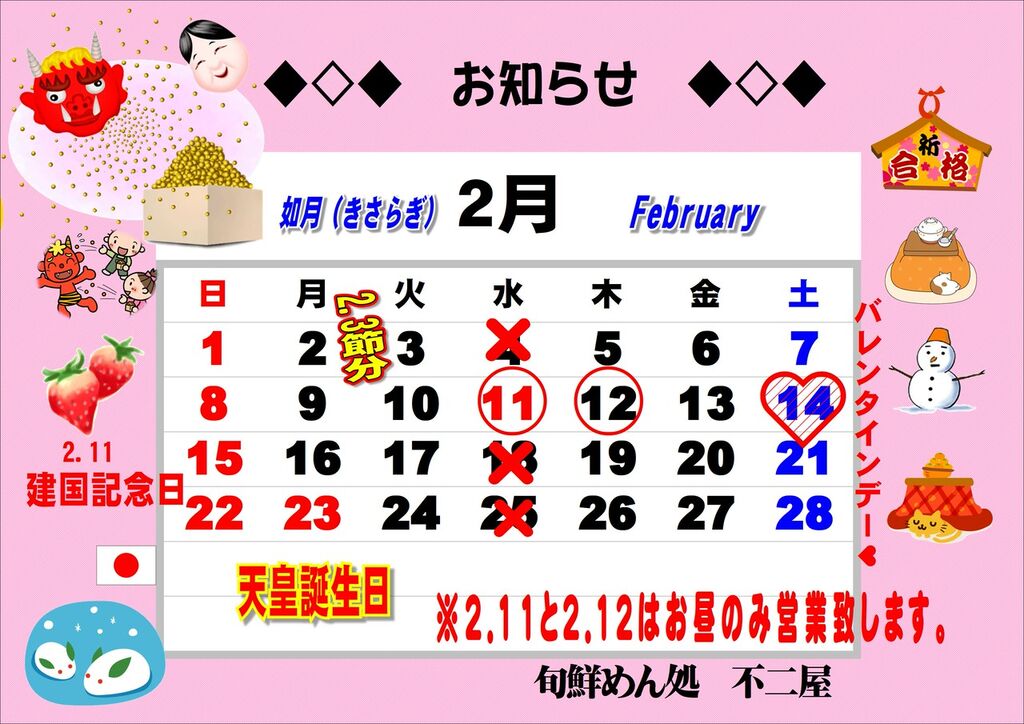 2.11はお昼のみ営業いたします。
