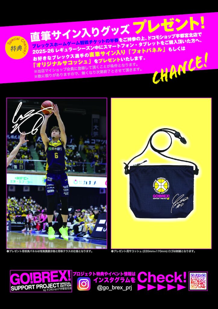 ブレックスホームゲーム観戦チケットの半券をご持参のうえ、ドコモショップ宇都宮北店で、2025-2026年レギュラーシーズン中にスマートフォン・タブレットをご購入いただいた方へ、お好きなブレックス選手の直筆サイン入り「フォトパネル」もしくは「オリジナルサコッシュ」をプレゼント★