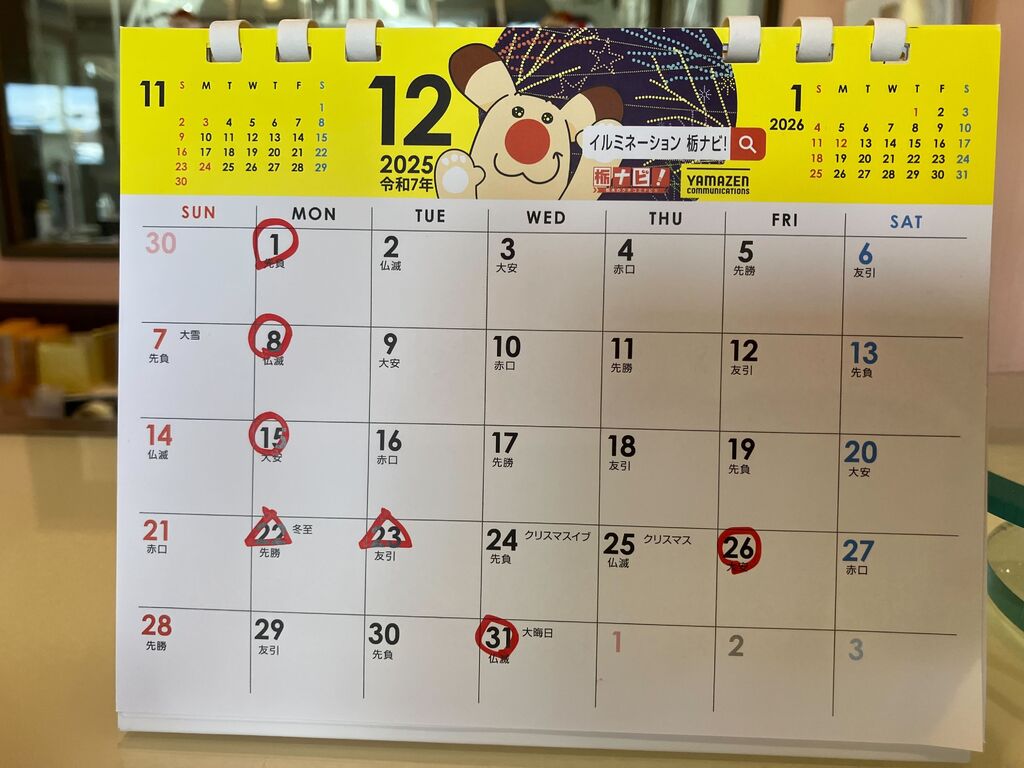 26日は臨時休業、29日はお店を開けて、年末休みは31日からです。