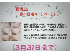 - イベント 夏間近!!春の脱毛キャンペーン(3月末迄)♪♪ (2026/03/13) UP