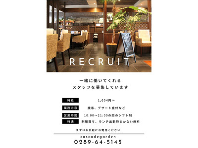 カスケードガーデンでは一緒に働くスタッフを募集しています!幅広い年齢層のスタッフが活躍しており、お店の雰囲気と変わらない職場環境です。元気…