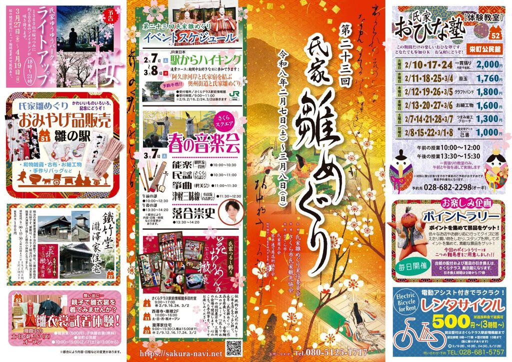 JR氏家駅前及びさくら市役所周辺の商店、公共施設や個人宅など、赤いのぼりが目印のお飾り処約50箇所にて、様々な雛飾りがお客様をお出迎えします。