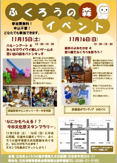 11月15日(土)、16日(日)に ふくろうにちなんだワークショップ(バルーンアートと昔遊び、読み聞かせ)を行います。