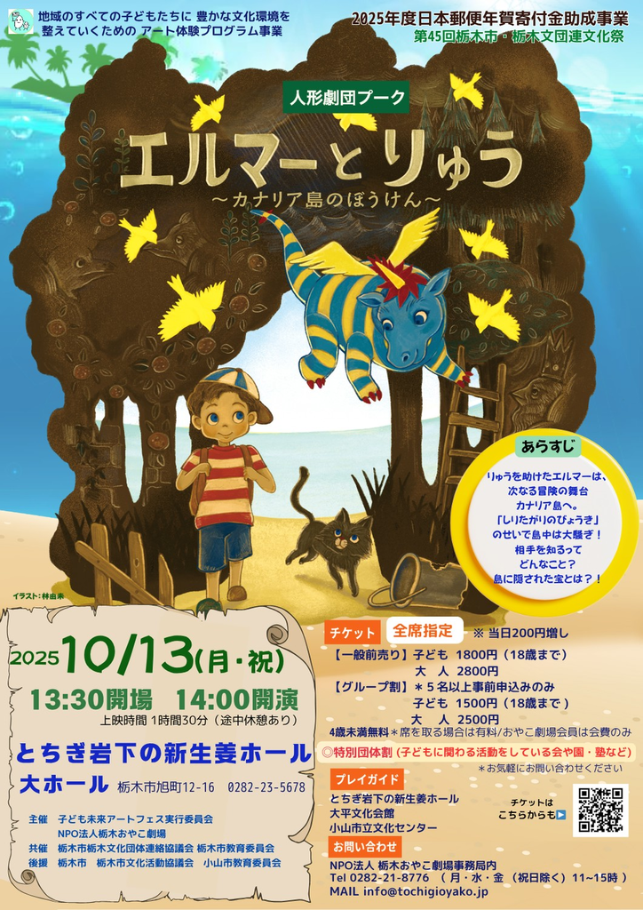 参加有料 【一般前売り】子ども(18歳まで)1800円/大人2800円 ※全席指定/4才未満は膝上無料 ※グループ割(前売りのみ)あり ※当日券は200円増し ※栃木おやこ劇場会員は会費のみで鑑賞可能 |