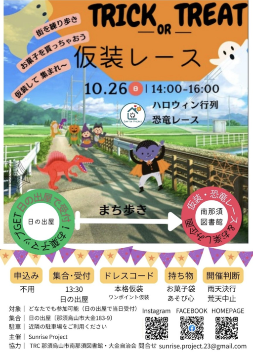 日の出屋から図書館までの道のりを仮装した皆さんと練り歩きます。全16箇所のお菓子スポットをご用意しました!GOALの南那須図書館に到着後は、①仮装・恐竜レース②大人の這い這いレース③図書館の窓ガラスに絵を描こう!の3つの企画もご用意しています。