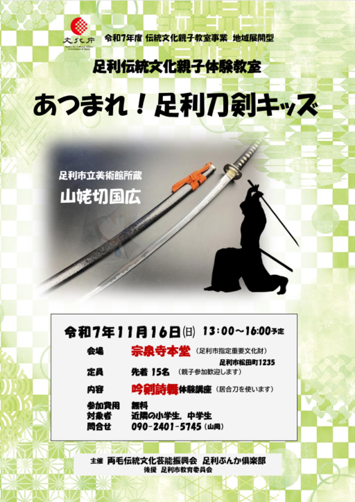 栃木・群馬両県で文化芸術活動に取り組むNPO法人「両毛伝統文化芸能振興会」足利ぶんか倶楽部(山岡 美奈子 理事長)は名刀『山姥切国広』(国重要文化財)を所有する足利市にちなみ、武士道と刀剣の魅力を後世に継承しようと、小中学生を対象にした親子体験教室を開催します。