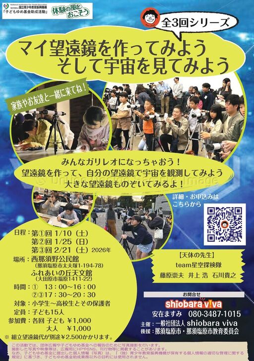 参加有料 対象年齢:小学生~高校生までのお子様とその保護者 各回 子ども:¥1000 /大人:¥1000 ※望遠鏡代が別途¥2,500かかります。 |