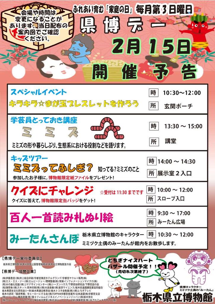 もっとみなさんに博物館を楽しんでいただくため、毎月第3日曜日の家庭の日に合わせて「県立博物館の日イベント 県博(けんぱく)デー」を開催しています。