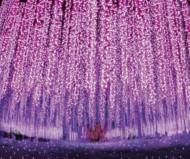 園全体をイルミネーションで彩る「 光の花の庭フラワーファンタジー」では、様々なイルミネーションを楽しむことができます。 光の花畑に童話の世界の様な夢のあるお城「フラワーキャッスル」や、園の象徴ともいえる大藤棚「奇蹟の大藤」には細部までこだわって 再現した花房が風に揺らめく様は、まるで本物の藤棚のような見応えです。