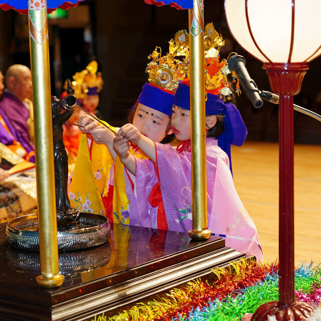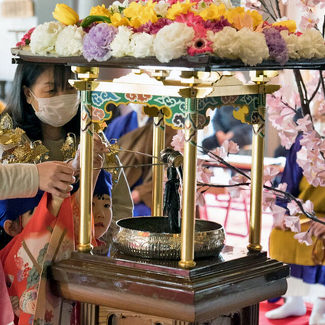 4月8日のお釈迦さまの誕生を祝う仏教行事のこと。神々が降りてきて祝福のために甘露の水を注いだという経典の説示に由来します。