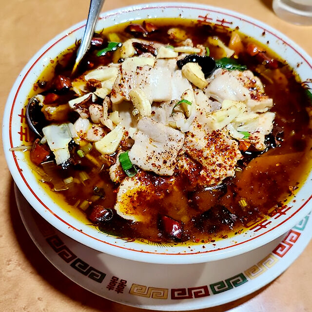豚肉の四川風煮込み(1380円)ニンニクもガッツリ入って辛いけど美味しいです。チャーハン(530円)これで普通盛り!エビのサクサク団子(880円)はエビマヨに上げた千切りのじゃが芋がついていて食感も美味しかったです。どれもボリューム満点なのでいつも食べきれません。注文は少な目がおすすめです(笑)(2021/12/17 訪問)