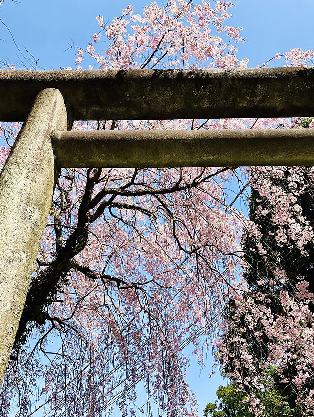 こんな素敵なシダレザクラをウォーキング途中に楽しめるなんて羨ましい(≧▽≦)鳥居越しの桜が青空映え~!