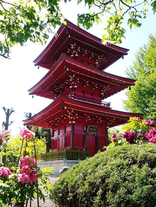 なんて美しい大輪の牡丹!こちらの藤も初めて見る藤かな?青空のもとで、美しい花たちと三重塔…ぜひぜひ拝見したいな~(^^♪