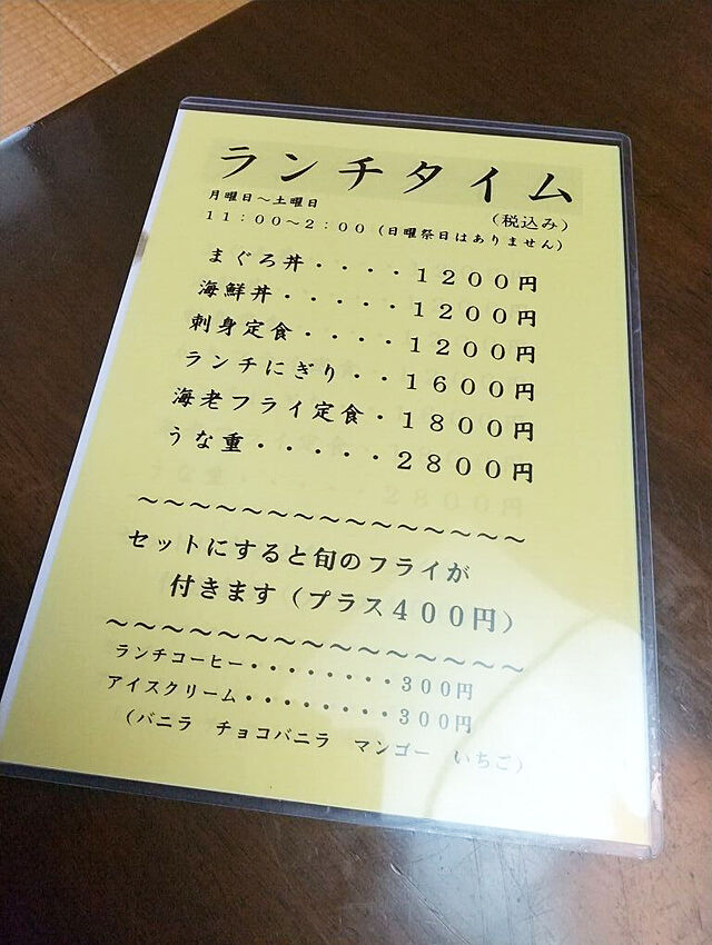 平日・土曜のランチメニューから、海鮮丼とランチちぎり、セットのフライを注文。