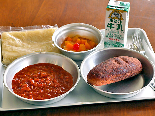 懐かしい給食の人気メニューが大集合★袋入りのソフト麺をミートソースに絡めてパクッ!トマトの酸味が効いた濃いめのミートソースがよく絡みます。揚げパンは、くちのまわりを気にしながらもバクっと頬張ってみて♪エモさ全開なランチをぜひお楽しみください!