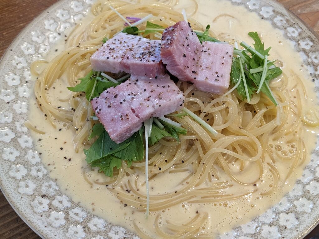 家族はふわとろたまごのオムライスホワイトソースとデミグラスソース、厚切りベーコンのカルボナーラを頼み、シェアしましたが、こちらもとっても美味しかったです。