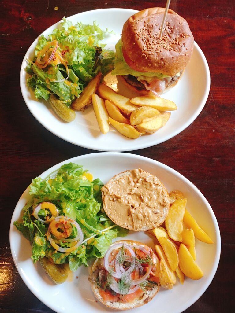 BLTバーガーとベーグルのオープンサンド(サーモン&クリームチーズ・ピーナッツバター)をドリンクのセットで注文♪