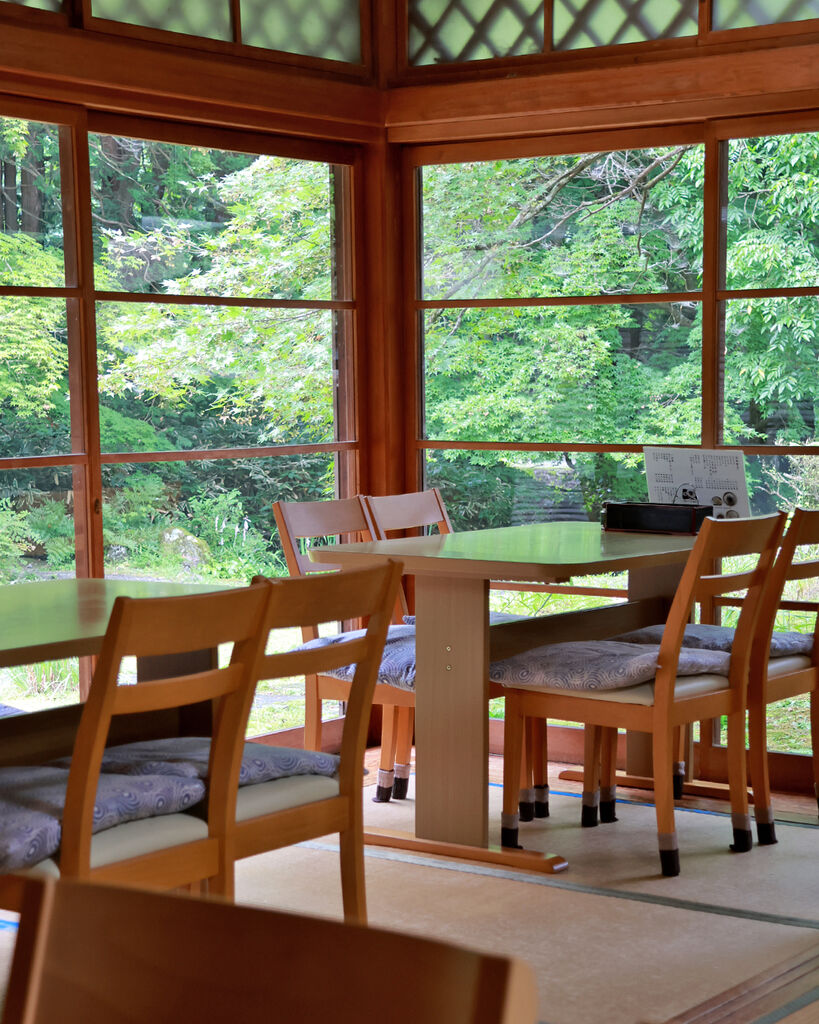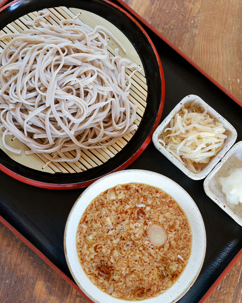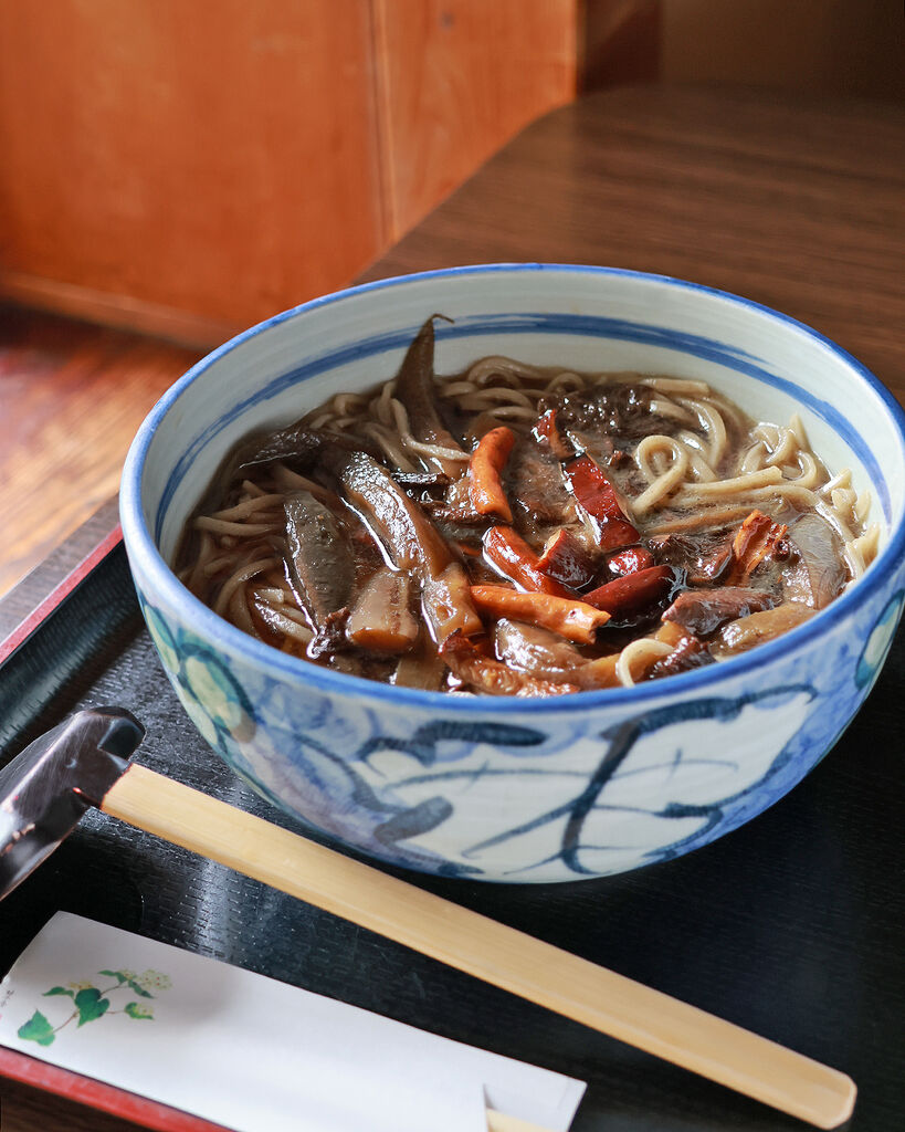 地元で栽培される玄そばを敷地内の製粉所から、挽きたて打ちたて茹でたてで味わえます。ちたけそばは、とちぎの伝統的な郷土料理。事前になすと一緒に炒めているので香ばしく、ちたけの強い香りと深いコクがしっかりとつゆになじんでいます。しっかり濃いめのつゆが冷えた身体にしみわたり、飲み干したくなるほどの旨味。歴史ある邸宅で味わうのも一興です。