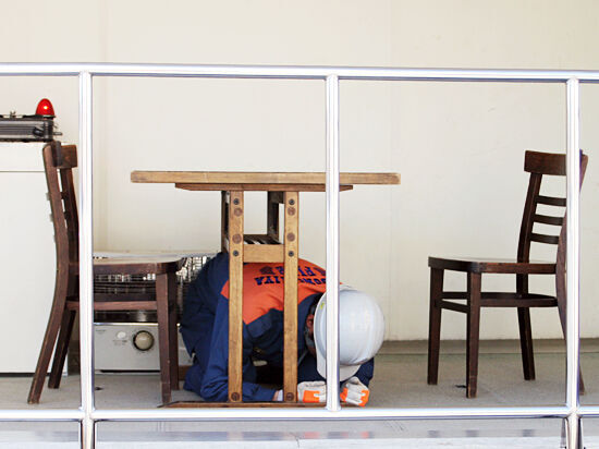 地震が起きたら、まずはテーブルなどの下に入り身の安全を確保してください。むやみに動き回ると、落下物に当たったりして危険です。身の安全が確保できてから、脱出口の確保をしましょう。