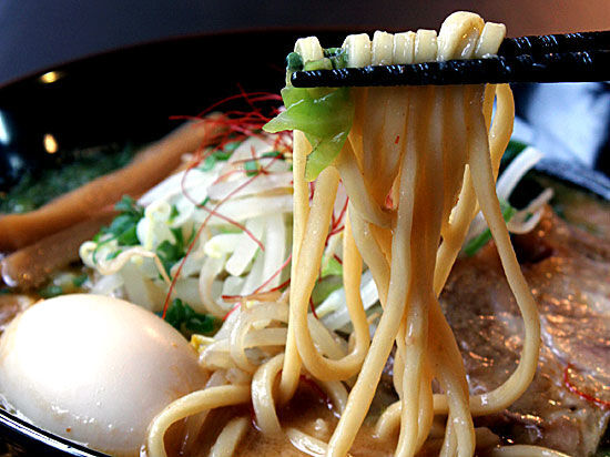 巷を大いに騒がせているラーメンといえば、「らー麺 彩羅」の“赤玉Panchiらー麺(892円)”。「痛いほど辛い!」というコンセプトで開発された、辛党のためのラーメン。唐辛子&豆板醤&自家製ラー油たっぷりの特製辛味噌ダレを、自慢の鶏白湯スープで割ったスープは、ド迫力の真っ赤っ赤!その独特のスパイシーな香りとコクのある辛味に、ハマってしまう人続出中。世間に、一大ムーブメントを巻き起こしています。