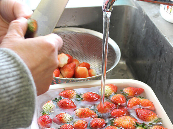 和氣さん「まずはよく洗って、実の部分とヘタの部分に分けます。検査するのは、食べることを想定される部分だけなんです。」