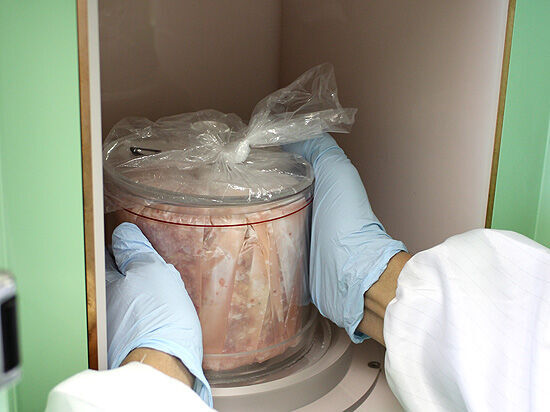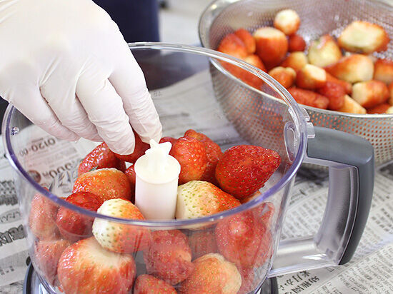和氣さん「細かくしたいちごは、専門の容器に入れてしっかり密閉!これで検査にかける前準備が整いましたよ。」