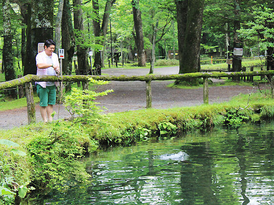 博物館を後にして、中禅寺湖沿いを爽快にドライブ!しばらく道なりに進むと、竜頭ノ滝の手前に「さかなと森の観察園」があります。園内の広い敷地は、マツやクヌギなどの林で覆われ、木々の間を埋めるように飼育池が点在しています。森の中を散策しながら魚たちに出会える、自然に溶け込む“魚の森”です。