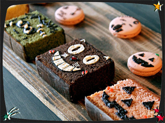 ★写真(左奥から)…ドラキュラが眠るフィナンシェの棺桶・オバケかぼちゃのマカロン・フランケンシュタインやクロネコなどハロウィンカステラ