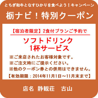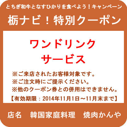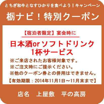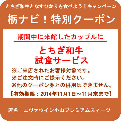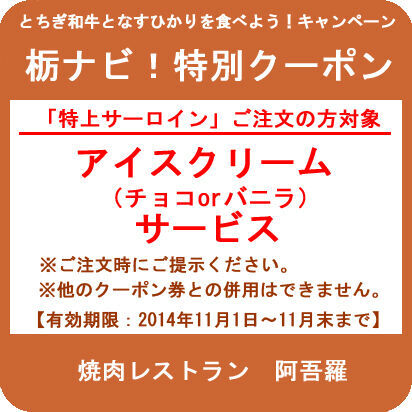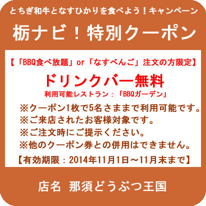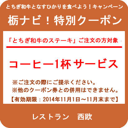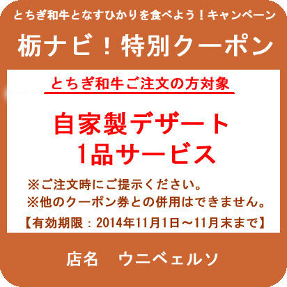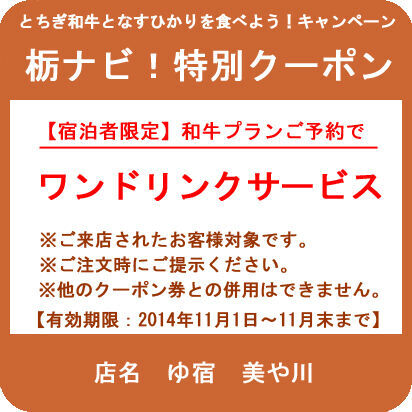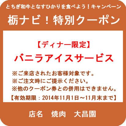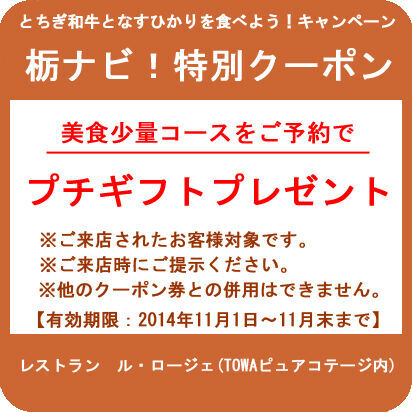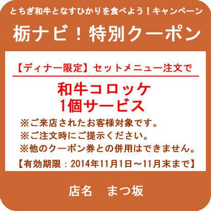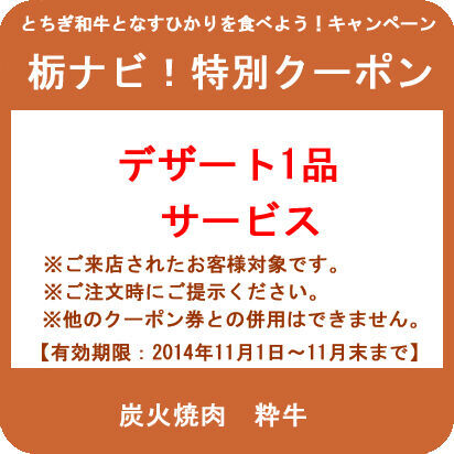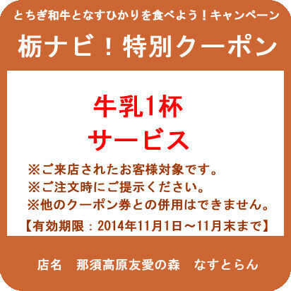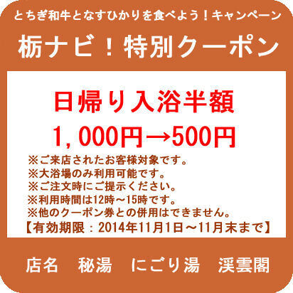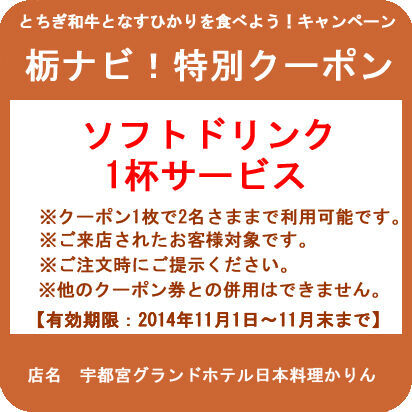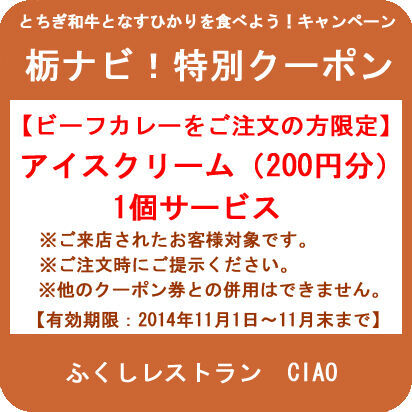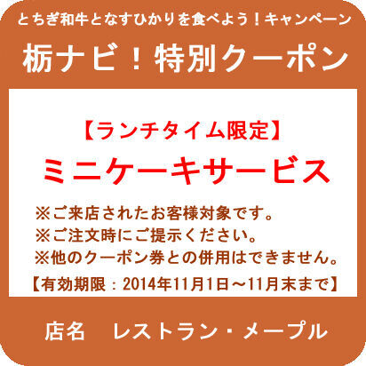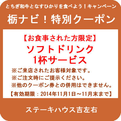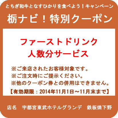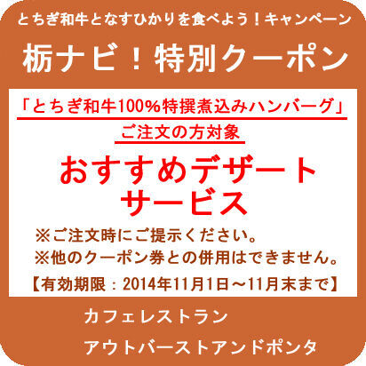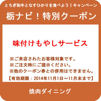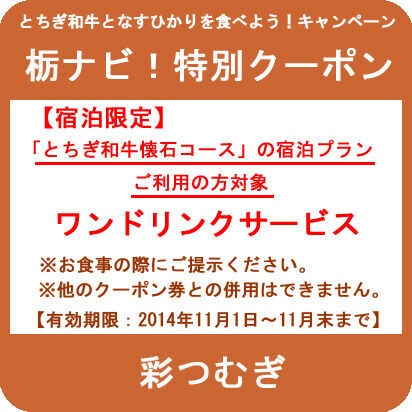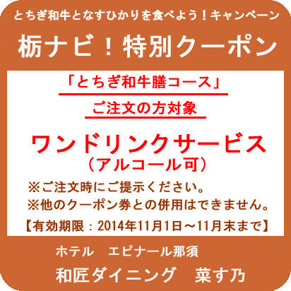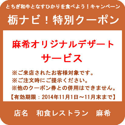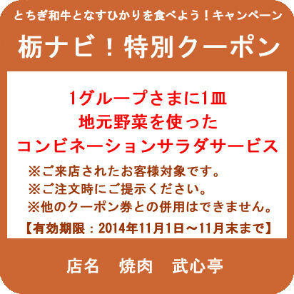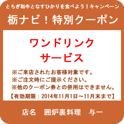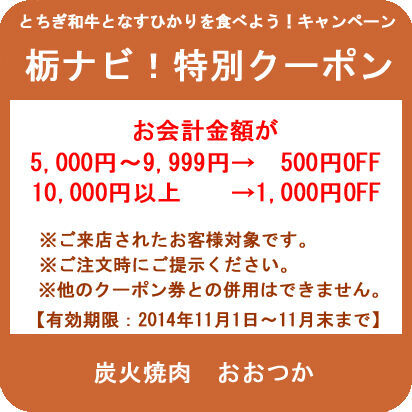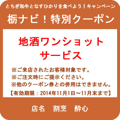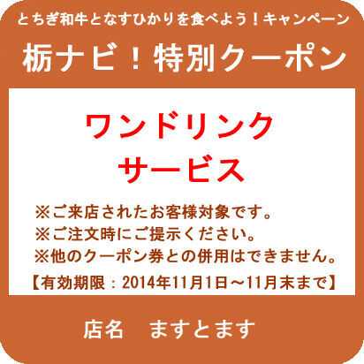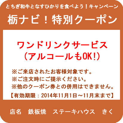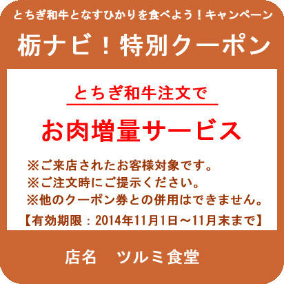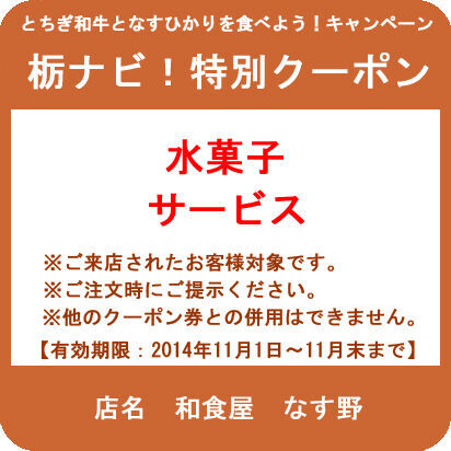 キャンペーン実施店一部にて、2014年11月1日~末までの『栃ナビ!特別クーポン』発行中!