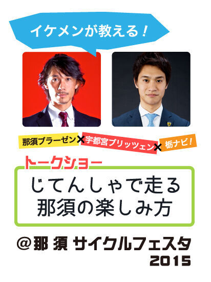 6月20日(土)~28日(日)の9日間開催される、全日本選手権大会那須サイクルフェスタ2015!北関東で初めて開催されるこの大会をもっと楽しんでもらうため「那須サイクルアカデミー」が6月27日(土)開催します☆那須ブラーゼン若杉さん、宇都宮ブリッツェン廣瀬さんと一緒に、ロードバイクで走る那須の楽しみ方をご紹介!トークショーだからこそ聞ける“ココだけの話”を聞きに、ぜひ遊びにきてね♪