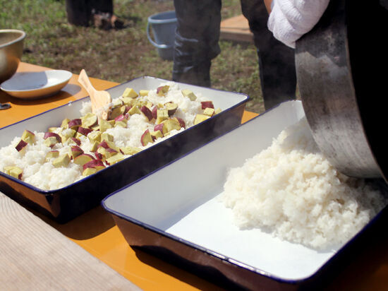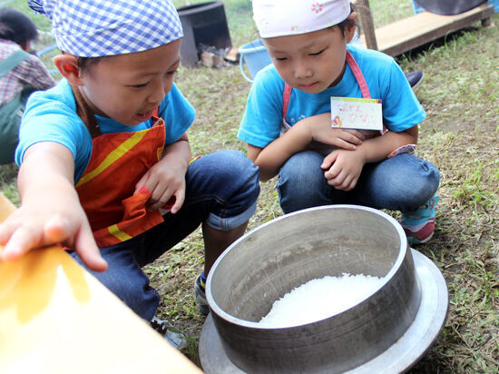 ドキドキの釜戸炊きは、火を入れるのも緊張!