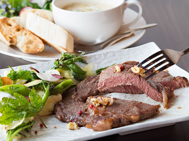 カフェの奥にある「ワイン&ステーキ LINDA feat.DE LOACH」では、最高のステーキを楽しめます。地元野菜たっぷりのサラダと柔らかな赤身肉は感動もの!