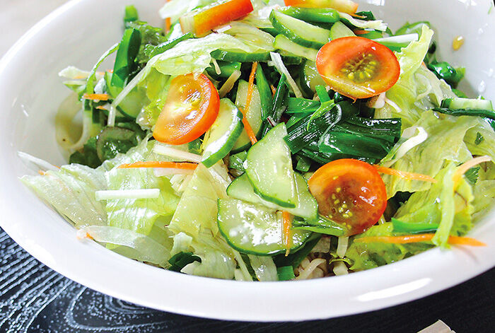 夏の定番人気メニュー。シャキシャキの新鮮野菜の上には、自家製の人参ドレッシングが。さらに、お好みでマヨネーズと絡めると◎!食欲の落ちる蒸し暑い季節にオススメです。