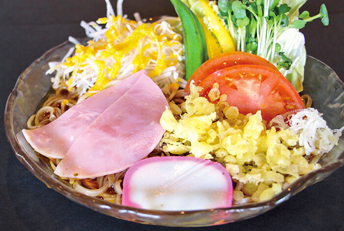 おそばの上に、野菜をたっぷりトッピング!ひんやり冷たく、ツルッとしたのど越しが◎!(夏期:1日限定10食)