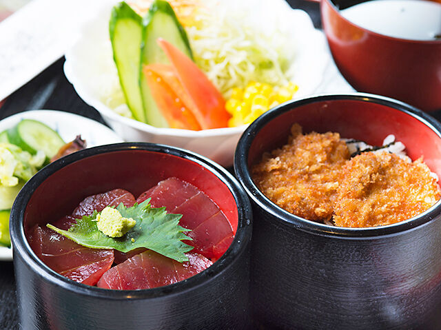 ソースかつ丼とまぐろ丼が一度に食べられます♪他にも、お刺身やハンバーグなどメニューも豊富。