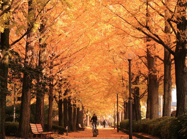 まっ黄色に染まるいちょう並木は一度訪れたい場所です。複合型遊具があり、お子さんも楽しめるスポットです。