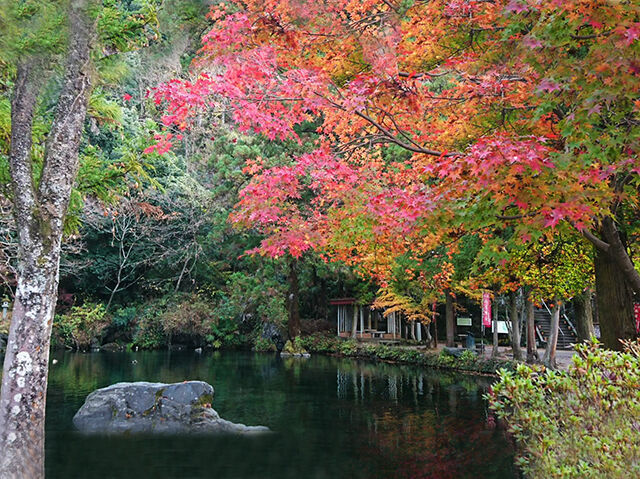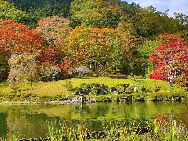 古峯園は清流大芦川の源流にあり、その流れを引き込んで作られた回遊式の大規模日本庭園です。庭が周囲の山々まで広がっているかのようなスケールで紅葉をお楽しみいただけます。