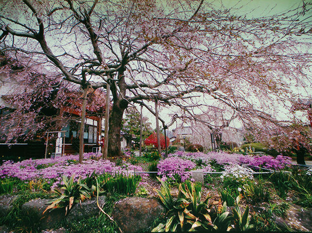 太平山の東側山麓に位置し、本堂正面にある樹齢約360年のしだれ桜は「岩しだれ」と呼ばれ、毎年3月下旬頃より薄紅色の一重の花が開花します。