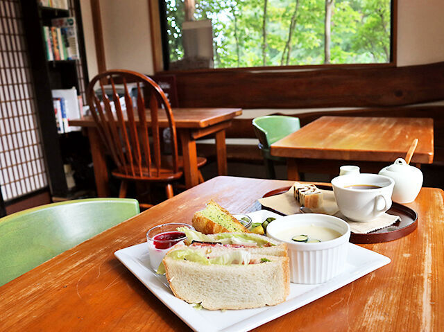 素敵なお庭と木のぬくもりが温かいお店。ランチタイム限定で食べられるサンドイッチには、自家栽培の季節野菜をたっぷりサンド!国産小麦と天然酵母で丁寧につくるパンが、力強い“素材の味”を思い出させてくれます。