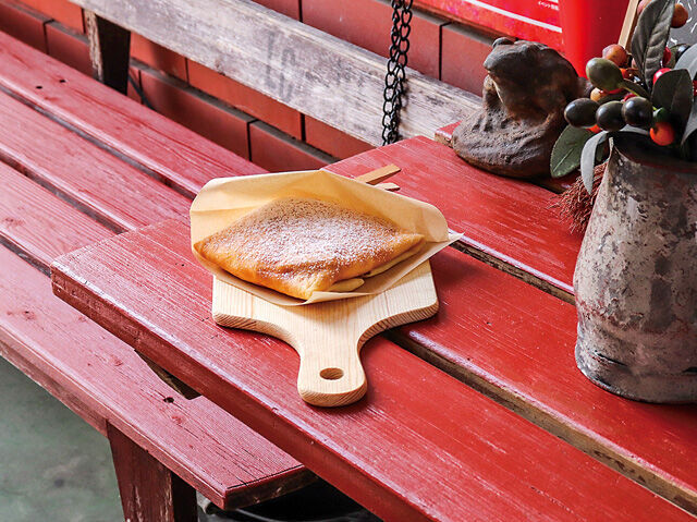 お店の入口には真っ赤なベンチ!屋根があるので、雨宿りにも◎!雨が降り出したら、「お店を利用しなくても、雨宿りしていいよ!」とやさしい店主さんがいるパッケへ駈け込んじゃおう♪