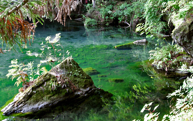 池の底までくっきり見えるほど透明な水は、古生層石灰岩の割れ目から湧きだしているそう。