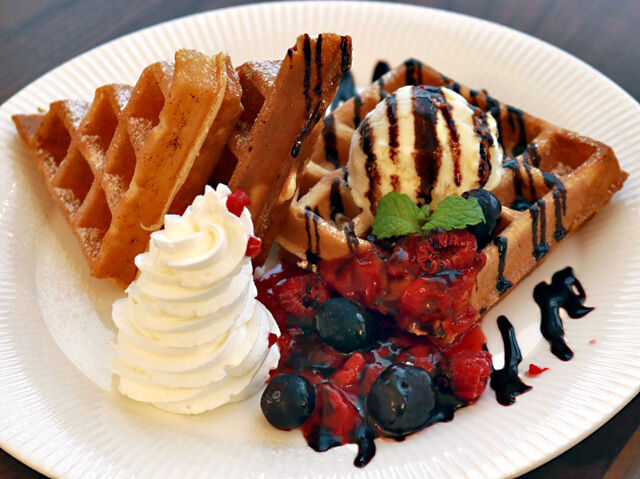 お買い物ついでにも◎!ごはんからデザートまでをギュギュっとワンプレートにした、コスパ抜群なプレートランチ。子どもたちが喜ぶニコチャンマークのケチャップソースハンバーグにチキンライス、季節のサラダとジュース付!しかも、サクッふわ食感の焼きたてワッフルまで付いて、ボリューム満点♪優雅な雰囲気の中、男体山を眺めながらゆったりとしたランチを楽しめますよ!