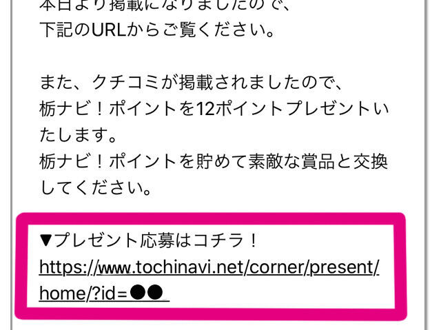 【2】「クチコミ掲載のお知らせ」メールが届いたら、プレゼントの応募URLをクリック。