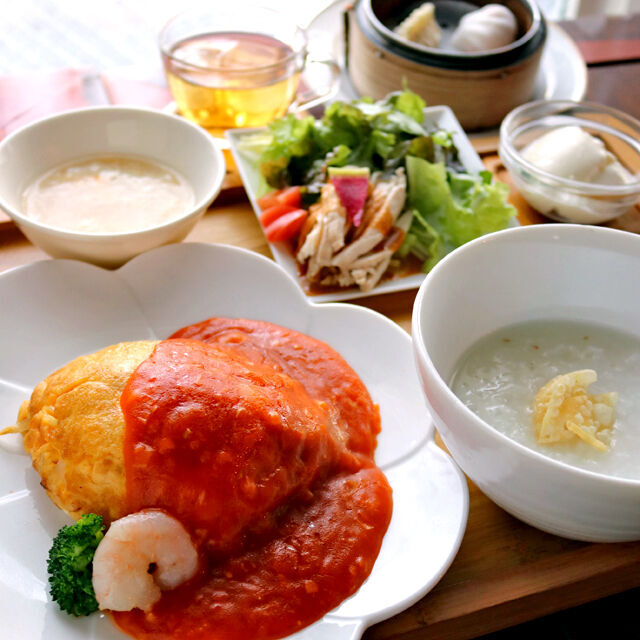 海老や野菜たっぷりのオムレツに海老とチーズのチリソースをかけた、チャイニーズスタイルのオムレツです。CUTEな中国の茶器や雑貨で彩られたオリエンタルな店内は異国情緒たっぷり!