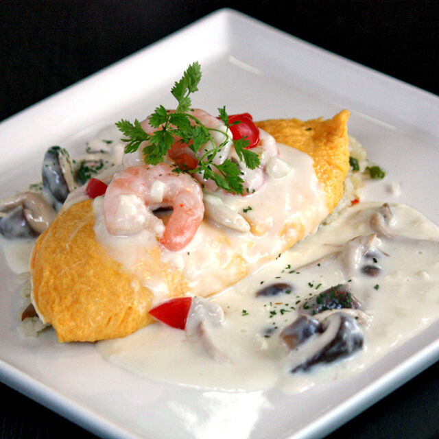 駅近のロケーションがとっても便利!料理が評判のコチラから、ふわふわ&クリーミーなスペシャルオムライスが登場♪ピラフを卵で包んで、海老&きのこのホワイトソースをたっぷりかけた、特製創作オムライスです。
