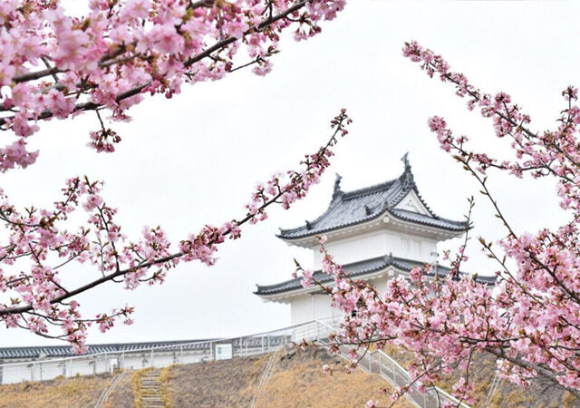 新聞で河津桜が咲いていることを知り、カメラを持って出かけました。平日なのに近くの駐車場は混雑していて、桜を見にきている人もたくさんいました。目的の河津桜は満開でピンクの花をたくさん咲いていました。お城と桜のコラボ写真を撮るのに必死でしたが、自分なりに満足する写真が撮れました。散歩にもなりいい気分転換になりました。(2021/03/12 訪問)
